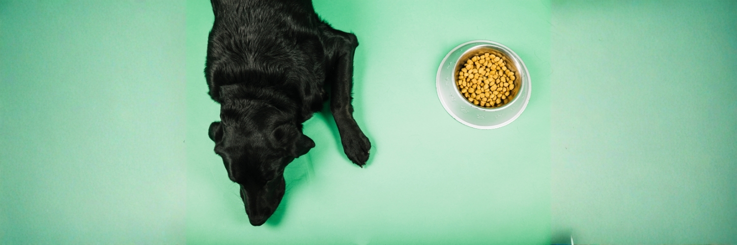 כלב שחור שוכב לצד קערת אוכל יבש על רקע ירקרק – אילוסטרציה למאמר על בחירת סדרת מזון כלבים של Monge