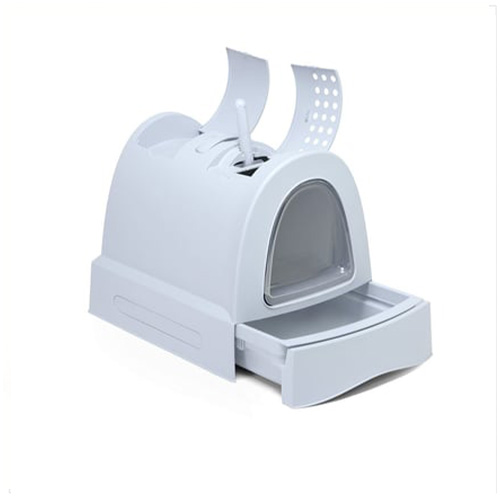 שירותים ZUMA מודרניים לחתולים, דלת דו כיוונית, מגירה נשלפת לניקוי קל, מסנן פחם וכף לאיסוף צרכים.